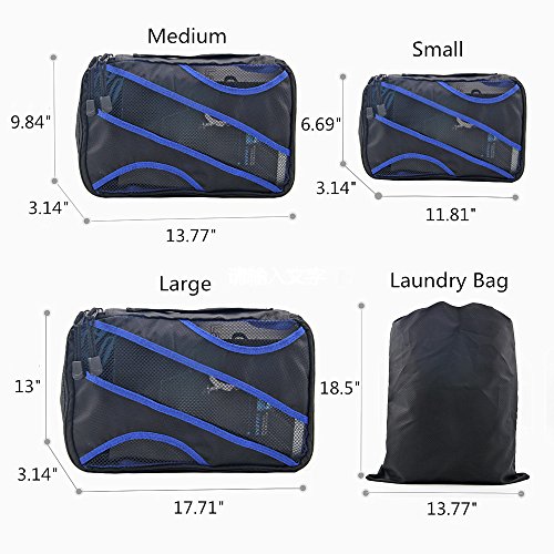 3 Packing Cubes: - Large: 17.71" x 12.99" x 3.14", Medium: 13.77" x 9.84" x 3.14", Small: 11.81"x 5"x 6.69", Laundry Bag: 18.5" x 13.77".