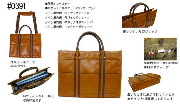 | カジュアルにお使いいただけるビジネスバッグです。 持ち手の異色ラインがデザインのアクセントになっています。 フロントには、ちょっとした小物類の収納に便利なオープンポケットが付いています。 メイン層はA4ファイル収納可能となっており、内側ポケットに、大きなオープンポケットと、 小物の整理に便利なオープンポケットと携帯ポケットがそれぞれ付いています。 また、置いた際に底に汚れがつかないよう、底ビョウが付いています。 オン、オフ問わず大活躍!! |