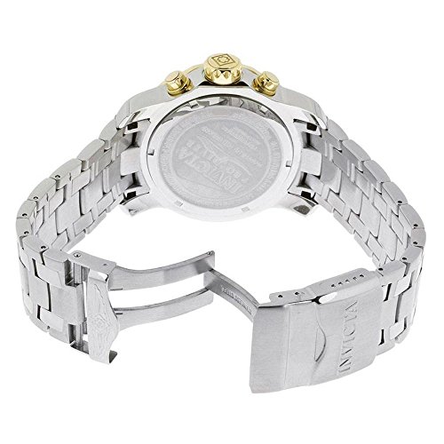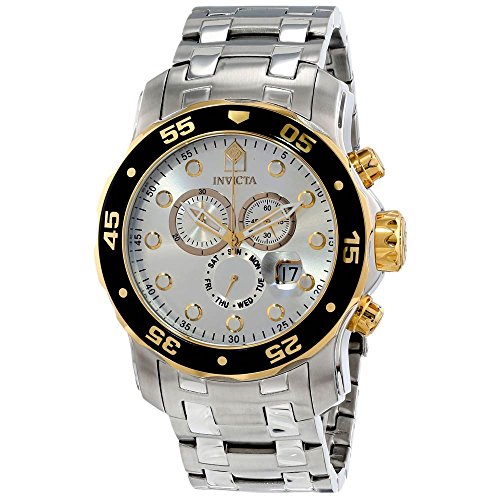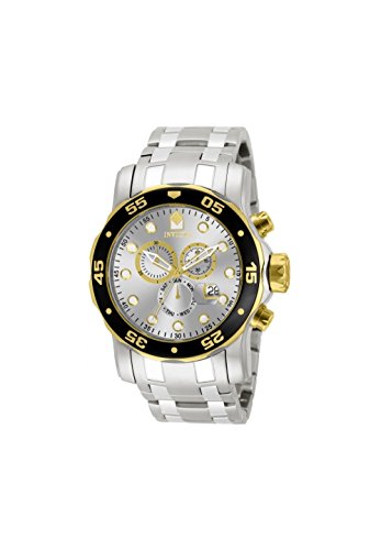 ReleaseDate : 2013-12-17 Studio : Invicta Publisher : Invicta Binding : Watch Product Description Stainless steel case with a stainless steel bracelet. Uni-directional rotating gold-plated bezel with black top ring. Silver dial with silver-tone skeleton hands and dot hour markers. Minute markers around the outer rim. Dial Type: Analog. Date display at the 4 o'clock position. Chronograph - two sub-dials displaying: 60 second and 30 minute. Day of the week sub-dial at 6 o'clock. Quartz movement. Scratch resistant flame fusion crystal. Pull / push crown. Solid case back. Case diameter: 48 mm. Case thickness: 12 mm. Round case shape. Band width: 26 mm. Band length: 8.25 inches. Fold over clasp with safety release. Water resistant at 200 meters / 660 feet. Functions: chronograph, date, hour, minute, second. Casual watch style. Invicta Pro Diver Chronograph Silver Dial Stainless Steel Mens Watch 80040. 0