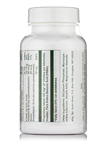 -. Binding : Health and Beauty -. Brand : Nutri-West -. Feature : B-Complex / NutriWest / Supportive Function: A total (hypoallergenic) formula that employs the synergistic action of all the B vitamins. Additionally, it is boosted with Choline and Inositol, which are vitamin-like substances that participate in fat metabolism. People who are exposed to stressful situations, or who have a poor dietary intake, may choose to supplement with B Complex. -. Label : Nutri-West -. Manufacturer : Nutri-West -. ProductGroup : Health and Beauty -. ProductTypeName : HEALTH_PERSONAL_CARE -. Publisher : Nutri-West -. Studio : Nutri-West -. Title : Nutri-West - B-Complex - 90