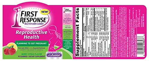 Youâ€TMre planning to get pregnant. But is your body? FIRST RESPONSE Reproductive Health Gummy Vitamins can help ensure that youâ€TMre getting some of the essential nutrients you need when youâ€TMre planning to get pregnant. From the #1 selling brandÆš supporting women throughout their pregnancy journey for over 25 years, FIRST RESPONSE Reproductive Health Multivitamin Gummies contain natural flavors and essential vitamins and minerals including folic acid, DHA & other nutrients needed to help prepare for pregnancy. First Response gummies are delicious, and with no iron, they are gentle on the stomach. This product uses high quality, purified fish oil that has been tested for mercury and PCBs. A two gummy serving of First Response Reproductive Health provides an excellent source of Vitamins A, C, D & E. It also provides 100% Daily Value of Folic Acid and 65 mg of omega-3 fatty acids of which 50 mg is omega 3 DHA. These delicious gummies are gluten free and have natural berry citrus flavor. FIRST RESPONSE. For every step in your pregnancy journey.