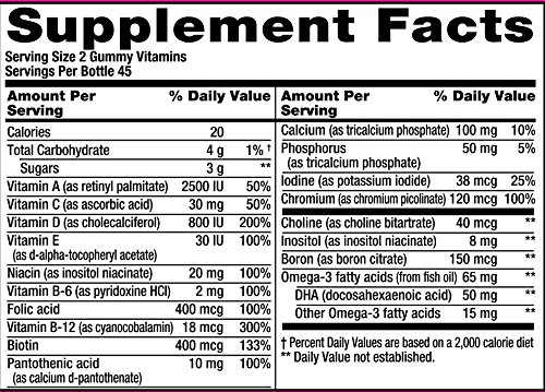 -. Feature : 100% DV Folic Acid / 50 mg of Omega-3 DHA to help support good health prior to pregnancy / Excellent source of Iodine, an essential nutrient for pre-pregnancy health / Natural flavors. Delicious & Easy to Use / Gluten free. With no iron added, gummies are gentle on the stomach