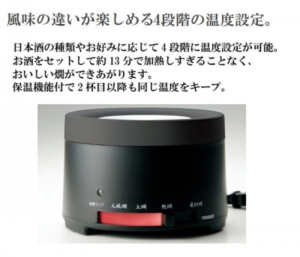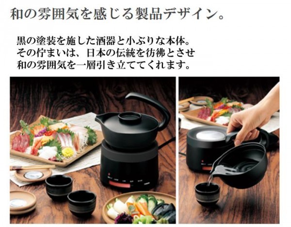 | 黒の塗装を施した酒器と小ぶりな本体。その佇まいは、日本の伝統を彷彿とさせ和の雰囲気を一層引き立ててくれます。日本酒の種類やお好みに応じて4段階に温度設定が可能。保温機能付で2杯目以降も同じ温度をキープ。手入れがしやすいからひれ酒などの変わり酒にも最適!! |