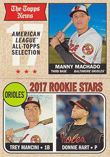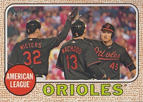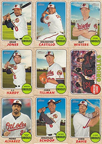 Baltimore Orioles 2017 Topps Heritage Baseball complete mint basic 13 card team set; it was never issued in factory form. Cards included are Manny Machado, Chris Davis, Adam Jones, Pedro Alvarez, Michael Bourn, Zach Britton, Welington Castillo, J.J. Hardy, Jonathan Schoop, Chris Tillman, Matt Wieters, a Rookie Stars Card of Trey Mancini and Donnie Hart and an Orioles Team Card.