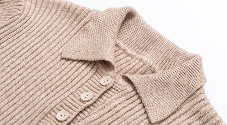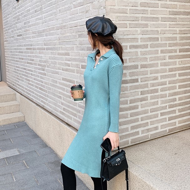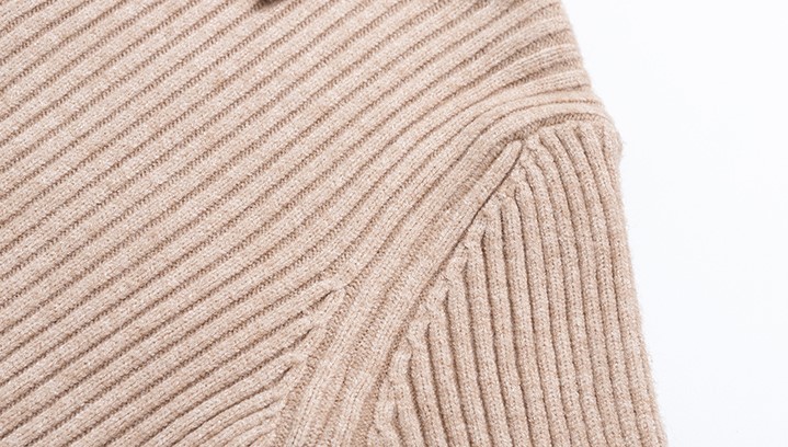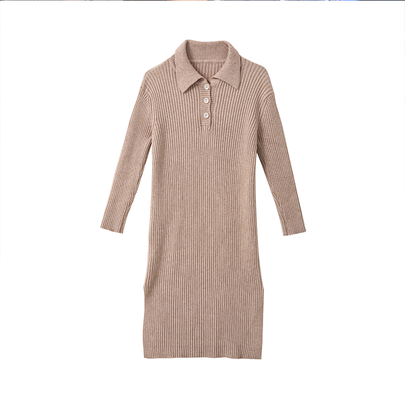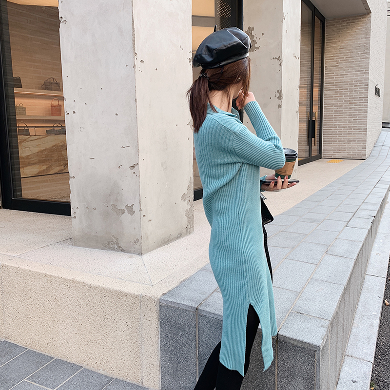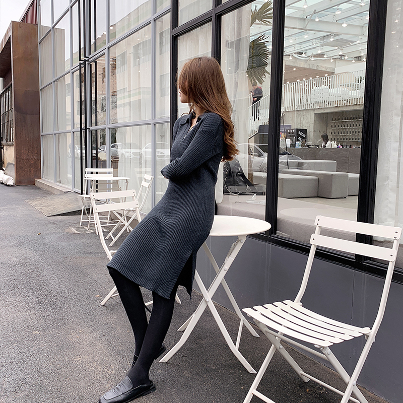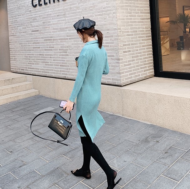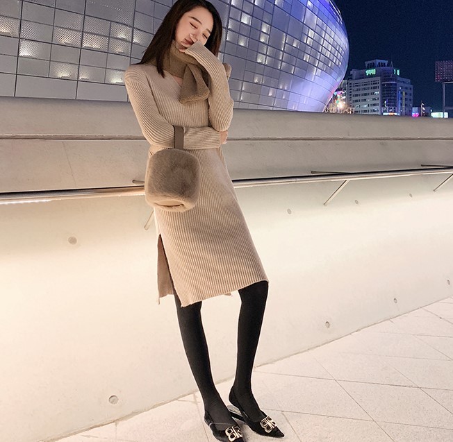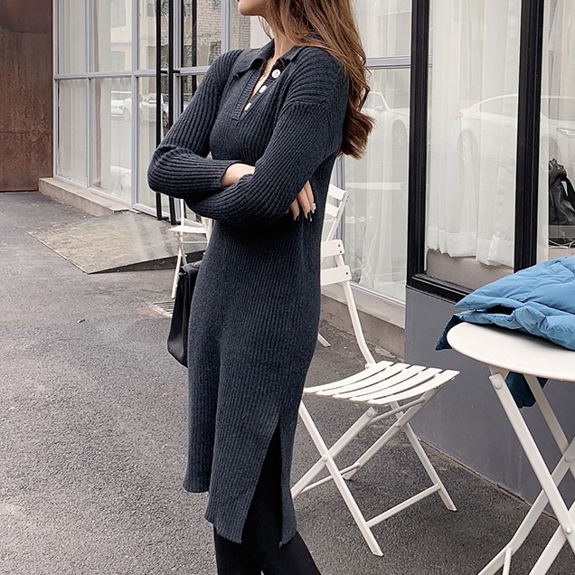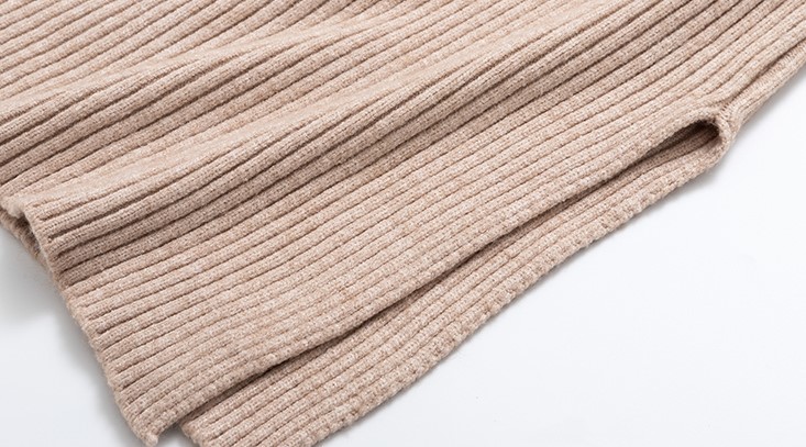 深めサイドスリットが入ったひざ丈リブニットワンピースです。