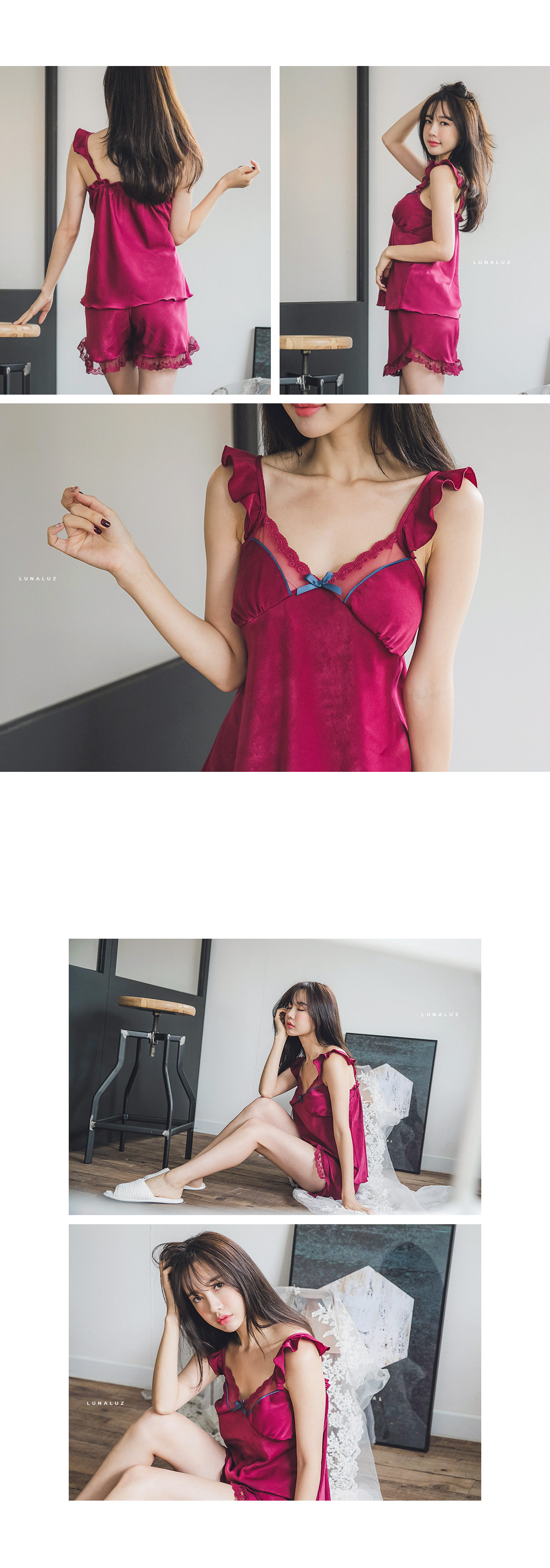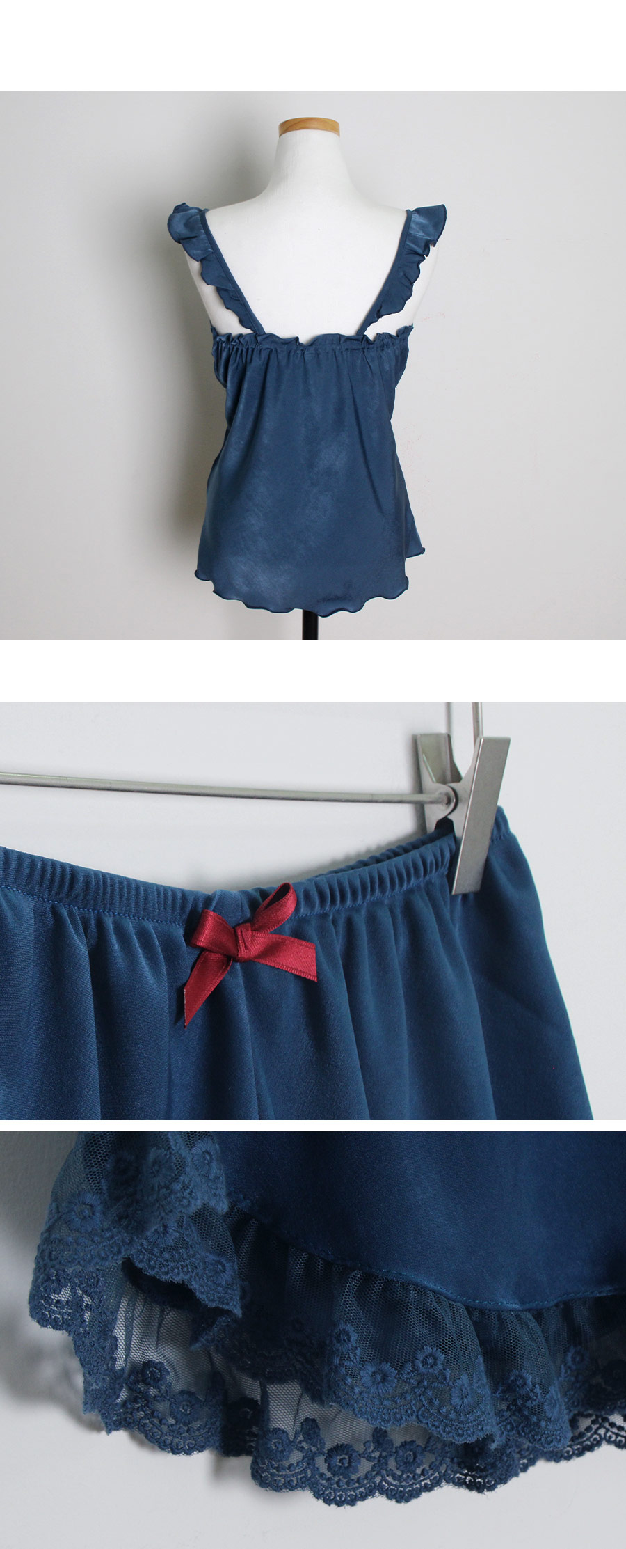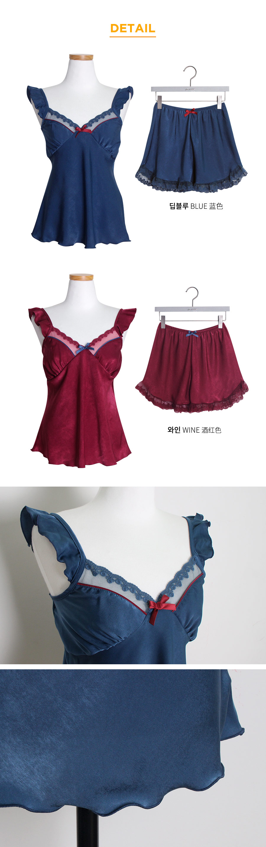 가공된 텍스쳐와 직접 염색한 망사레이스의 조화 빛에 따라 감도는 고급스러운 워싱 표면이 만족도를 더 높여 줄 거에요~! 광택이 도는 소재가 아닌 고급스러운 윤기가 흐르는 네츄럴한 느낌의 원단이랍니다. 피부에 닿는 터칭감이 굉장히 좋고, 부드럽게 하늘거리는 소재감이 실루엣을 더 예쁘게 살려줍니다. 컬러는 섹시한 와인, 오묘한 딥블루 컬러 2가지로 구성해 보았습니다. DETAIL여성스러움을 극대화 시켜주는 바스트 라인과 곡선 패턴으로 더 슬림하고, 섹시하게 연출할 수 있는 캐미솔set 입니다. 망사 레이스 스칼럽을 살려주는 디테일로 하나하나 세심하게 봉제한 디자인입니다. 곡선으로 파이핑을 다시 봉제해 깔끔하게 포인트를 주고, 좀 더 볼륨감 있어 보이는 고난위도의 패턴 봉제 작업이 들어간 슬립웨어 입니다. 어깨 스트랩에 프릴 장식을 달아 전체적인 분위기를 다시 한 번 살려주었습니다. 끝단까지 인터록을 쳐 말리지 않도록 세심하게 작업했으며 쇼츠의 하단에는 가벼운 망사레이스를 봉제해 마무리했습니다. 고난위도의 패턴, 봉제 작업이 들어간 캐미솔set로 소장가치가 높습니다. 100% 국내 제작으로 봉제, 소재의 마감이 깔끔하고 디자인의 퀄리티가 높아 선물로도 강력 추천해 드립니다. SIZE평균 44반size~55반size까지 커버 가능한 free 사이즈 입니다.