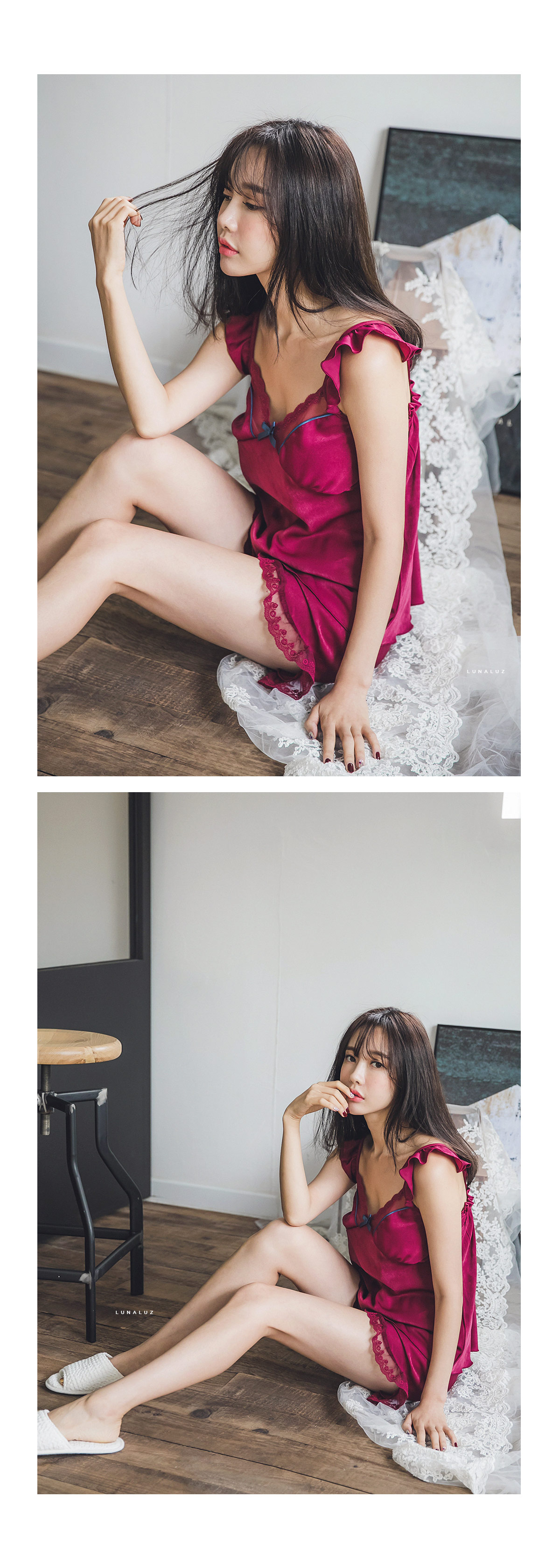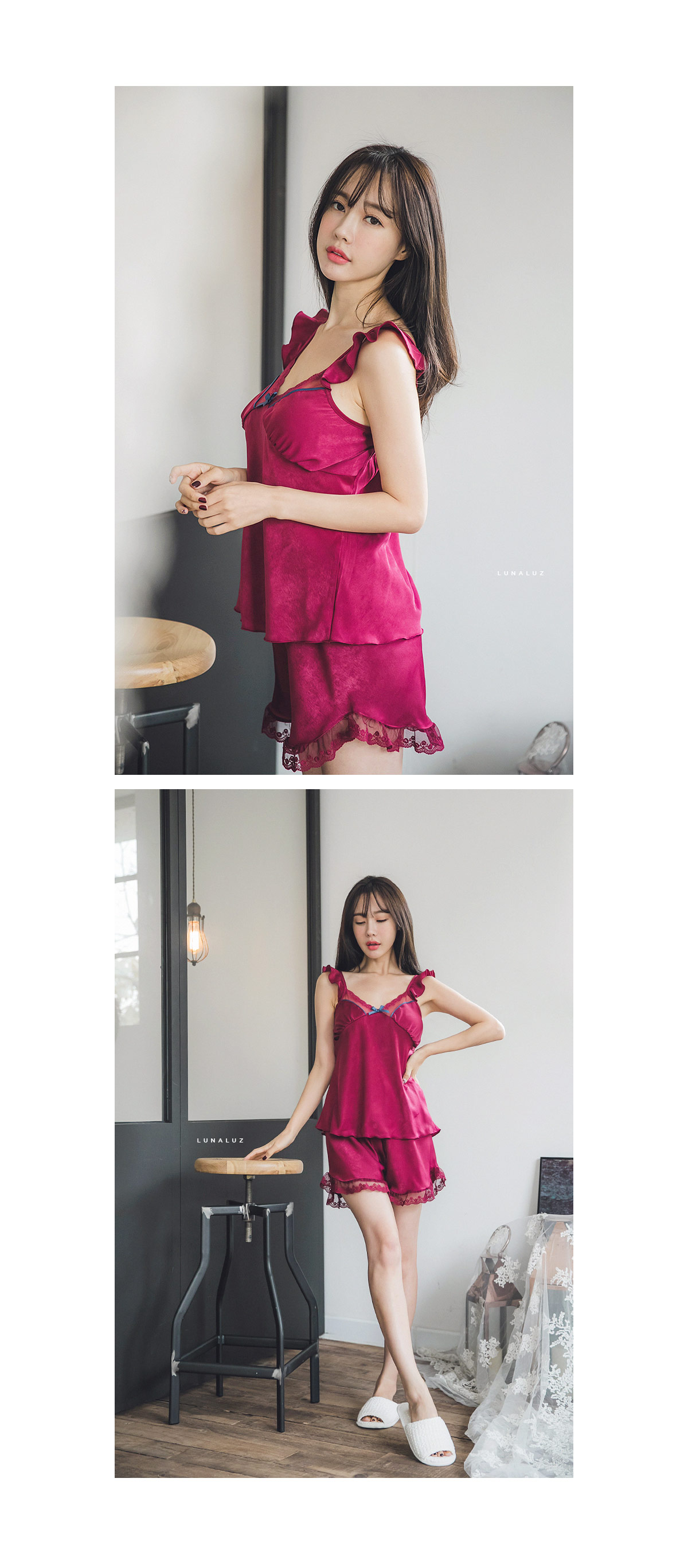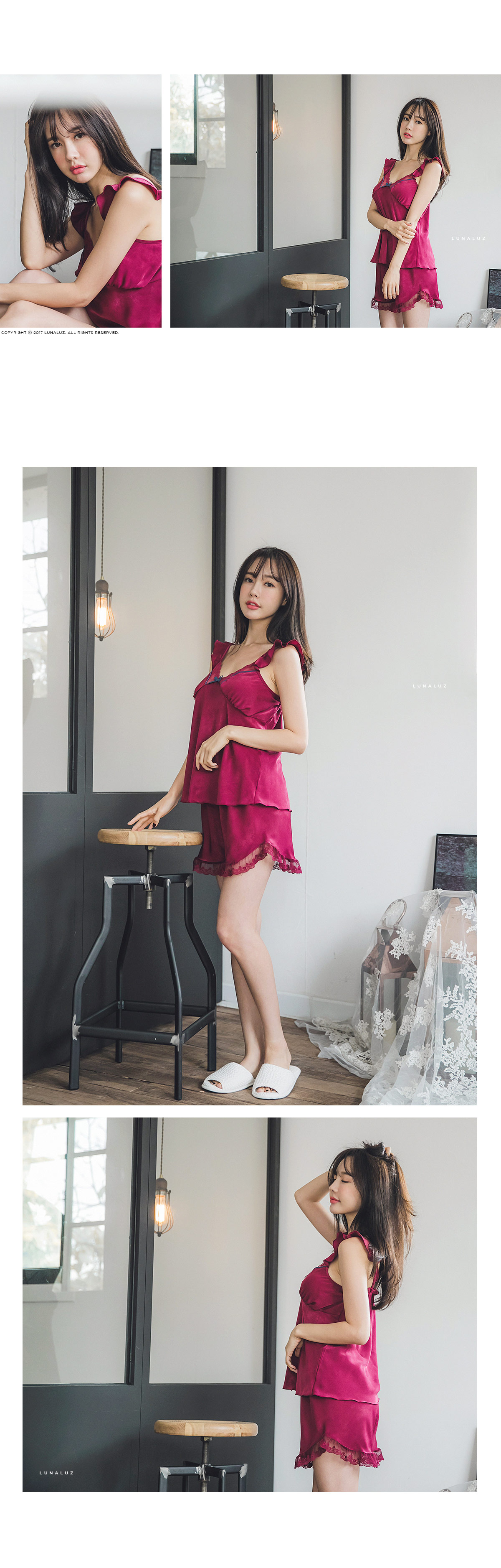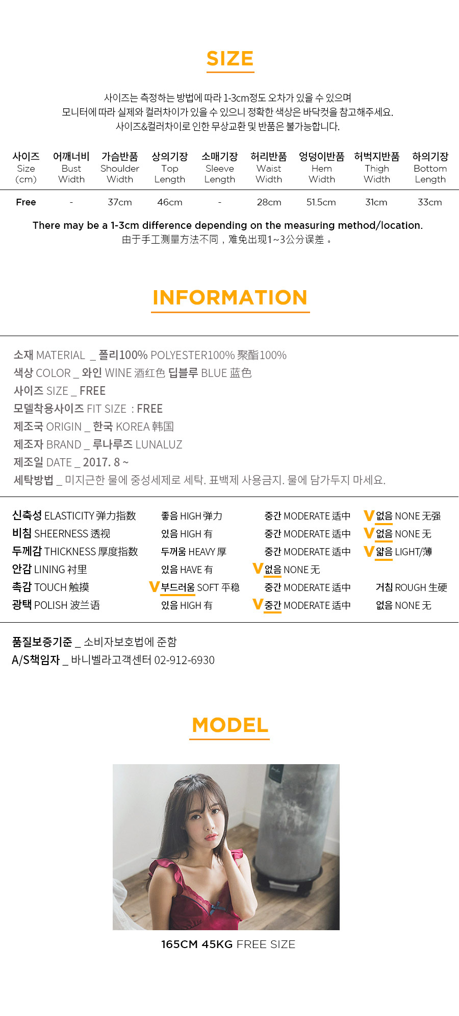 가공된 텍스쳐와 직접 염색한 망사레이스의 조화 빛에 따라 감도는 고급스러운 워싱 표면이 만족도를 더 높여 줄 거에요~! 광택이 도는 소재가 아닌 고급스러운 윤기가 흐르는 네츄럴한 느낌의 원단이랍니다. 피부에 닿는 터칭감이 굉장히 좋고, 부드럽게 하늘거리는 소재감이 실루엣을 더 예쁘게 살려줍니다. 컬러는 섹시한 와인, 오묘한 딥블루 컬러 2가지로 구성해 보았습니다. DETAIL여성스러움을 극대화 시켜주는 바스트 라인과 곡선 패턴으로 더 슬림하고, 섹시하게 연출할 수 있는 캐미솔set 입니다. 망사 레이스 스칼럽을 살려주는 디테일로 하나하나 세심하게 봉제한 디자인입니다. 곡선으로 파이핑을 다시 봉제해 깔끔하게 포인트를 주고, 좀 더 볼륨감 있어 보이는 고난위도의 패턴 봉제 작업이 들어간 슬립웨어 입니다. 어깨 스트랩에 프릴 장식을 달아 전체적인 분위기를 다시 한 번 살려주었습니다. 끝단까지 인터록을 쳐 말리지 않도록 세심하게 작업했으며 쇼츠의 하단에는 가벼운 망사레이스를 봉제해 마무리했습니다. 고난위도의 패턴, 봉제 작업이 들어간 캐미솔set로 소장가치가 높습니다. 100% 국내 제작으로 봉제, 소재의 마감이 깔끔하고 디자인의 퀄리티가 높아 선물로도 강력 추천해 드립니다. SIZE평균 44반size~55반size까지 커버 가능한 free 사이즈 입니다.