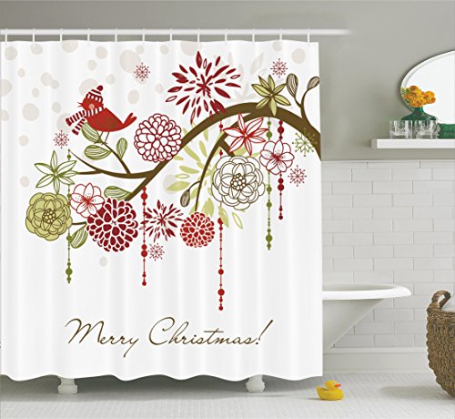 Merry Christmas Shower Curtain Christmas Bathroom Curtains by Ambesonne, Fabric Shower Curtain Xmas Floral Winter Themed Red Bird with Hat and Scarf on Blooming Tree, Set with Hooks, Green White