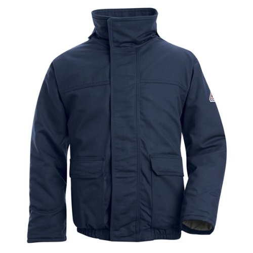Studio : Bulwark Publisher : Bulwark Binding : Apparel Product Description Bulwark Excel FR ComforTouch insulated bomber jacket. Fabric made of 7 ounces, twill 88 percent cotton/12 percent nylon. Water repellant. Lining: 100 percent cotton. Insulation package: 12 ounces, 100 percent modacrylic. Separating, heavy-duty, Nomex taped brass zipper, fully covered with two-layer storm flap, concealed snap closure. Fully insulated stand-up collar. Knit storm cuff within hemmed sleeve ends. Two large external patch pockets, with concealed snap secured flaps with hand warmers. One inside chest pocket. Deep-pleated action back. Fully-tunneled elasticized waistband. Inside zipper guards on all zippers. Accommodates snap-on hoods, sold separately. Home wash and industrial wash. 0