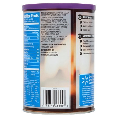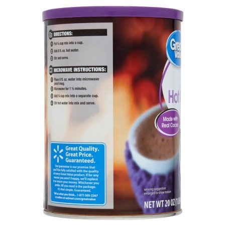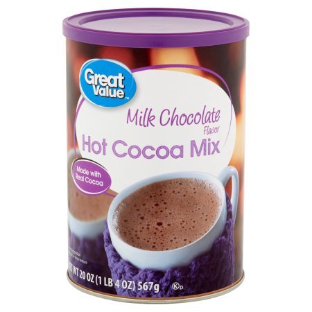 Studio : Great Value Publisher : Great Value Binding : Health and Beauty Product Description Relax and enjoy a steaming cup of cocoa with Great Value Hot Cocoa Mix. It is ideal for evening get-togethers during the holidays or for winter parties at the office. The rich milk chocolate-flavored hot cocoa drink mix contains no artificial colors and is kosher. The can of cocoa powder can produce 16 warm and delicious servings. Keep this item on hand at all times for friends and family members who are visiting during the cold winter months. The powdered mix comes in a resealable container. Great Value Milk Chocolate Flavored Hot Cocoa Mix, 20 oz: 0