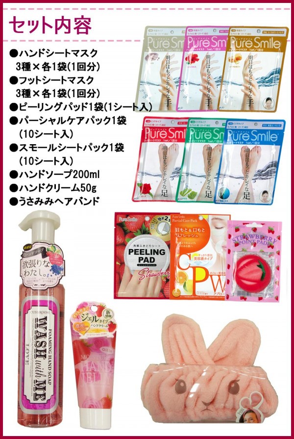 | 仕様 | 【商品区分】 マスク・パック・ピーリングパッド・ハンドクリーム・ハンドソープ:化粧品 ヘアバンド:雑貨 |