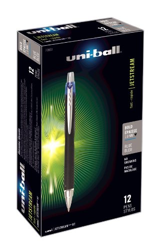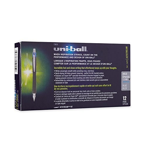 Jetstream RT Retractable Roller Ball Pens, Bold Point, Blue Ink, Pack of 12. Unique hybrid ink offers the smoothness of a gel with the quick-drying properties of a ballpoint. Ideal for left-handers because the ink dries so fast, there's little chance of smudging. Uni Super ink is specially formulated to become trapped in paper, helping prevent criminal check washing and other document alteration. Archival-quality, acid-free ink is fade- and water-resistant. Retractable tip, embossed grip and stainless steel accents. 1.16 inches long by 3.36 inches wide by 6 inches high. 0.384 pounds. UPC for this product is: 70530738339 Related search terms for this product include: uni ball, uni-ball, retractable pen, rollerball pen, ink pen.