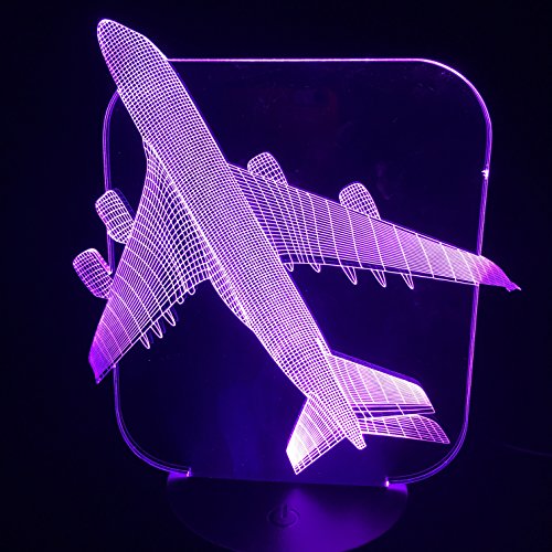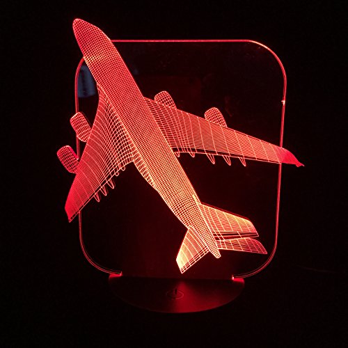 -. Feature : Aircraft Warplane Model Creative 3D Night Light Touch Jet Plane Desk Lamp LED Illusion Lamp Bedside Lamp Cool Toy / 7 Colours change: Red, Green, Blue, Yellow, Cyan, Pink, White / Airplane 3d lamp Perfect for Office/Hotel/Living Room/Bedroom/Coffee bar/KTV /Gift / Birthday/ Holiday / 3D vision effect, especially in the dark or take a photograph, the vision thrill will be strong! / Smart Touch button : you can change the color by press the button, press it first the lamp light up, and press it again will change to another light.