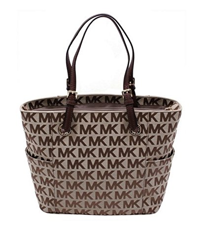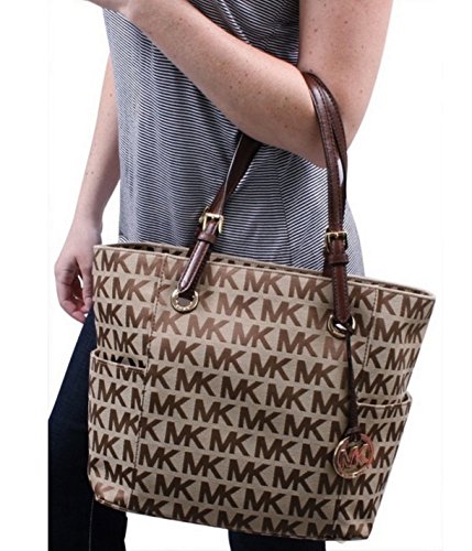 This mid-size East West Tote is wrapped in Michael Kors monogram Signature block print on beige and ebony jacquard fabric. It is trimmed in mocha brown leather with golden hardware. The interior is lined in beige Kors monogram fabric and features a center zippered wall pocket with an open compartment on either side. The front compartment features two open slip pockets. The back has another 2, along with a zippered pocket and a key clip. There are small side gusset pockets for additional storage, and a removable Kors circular logo hang charm. Four metal feet help protect the bottom of your bag. Dual mocha brown leather straps have a comfortable drop of 8.5 inches. The overall measurements are approximately 11 inches (L) at the bottom tapering to 15 inches (L) at the top x 11 inches (H) x 5.5 inches (W).Feature