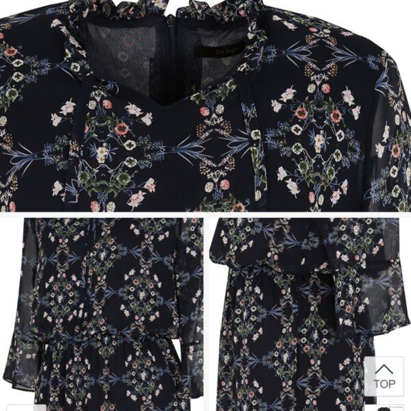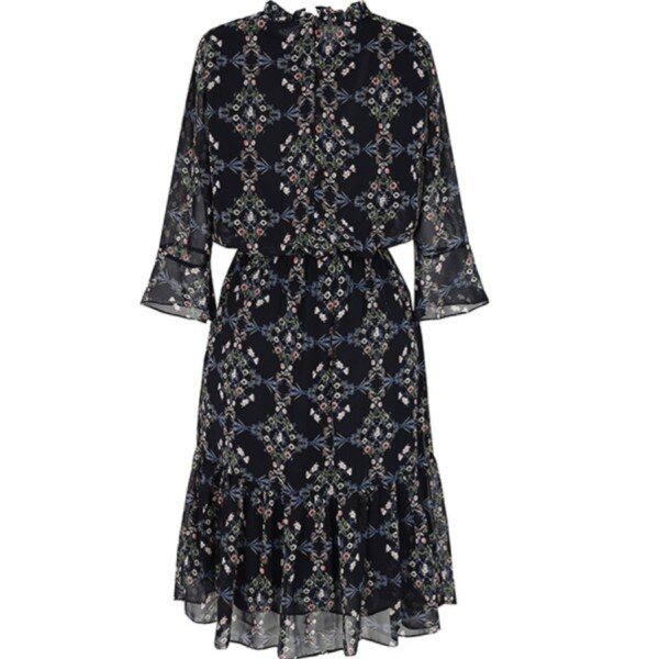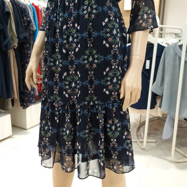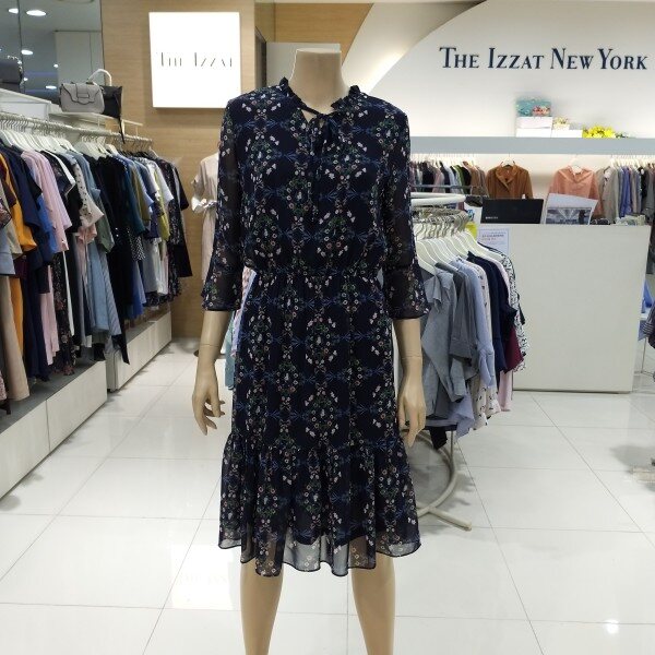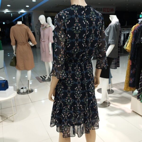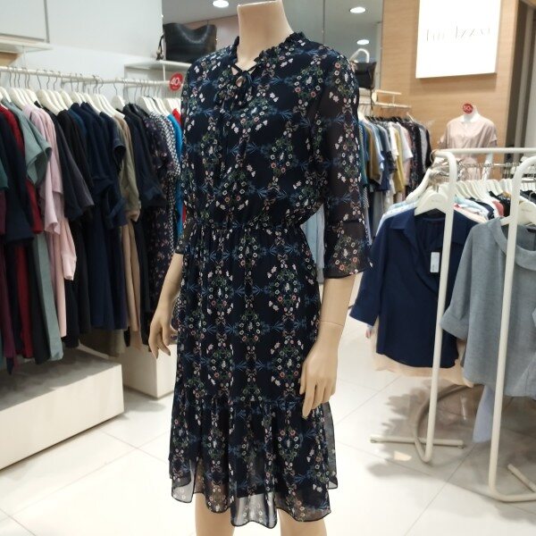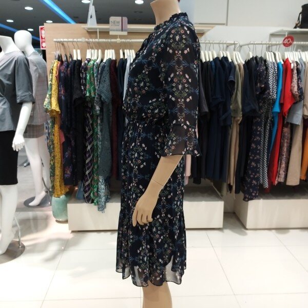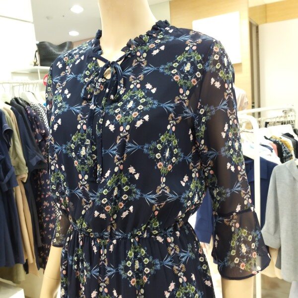 나팔 실루엣의 소매 디자인이 특징적이며 스커트 밑단 러플 디테일과 프릴 장식된 네크라인의 스트랩으로 매듭 코디를 연출 할수 있는 빈티지한 무드가 느껴지는 플로럴 패턴의 쉬폰 원피스입니다.허리 스트링과 폴리소재로 편안한 착용감과 활동성에 좋습니다.