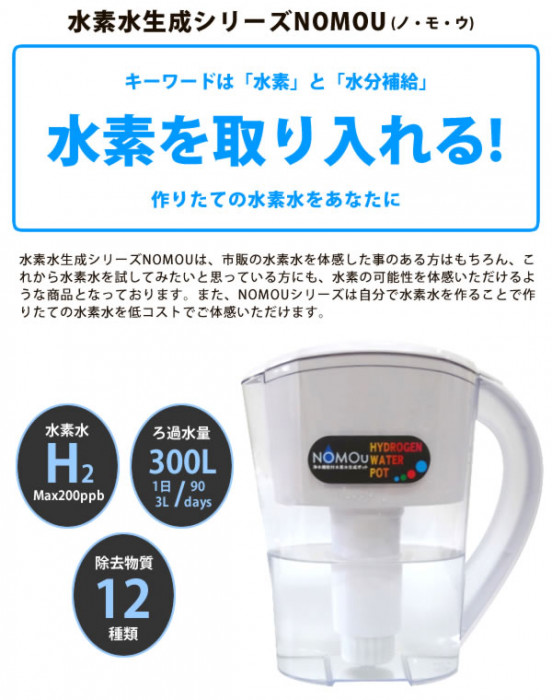 | 「水素水」を手軽に低コストで始められる水素水生成ポット。ご家庭や職場で使える大容量モデルです!! |