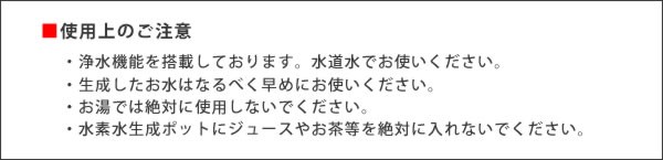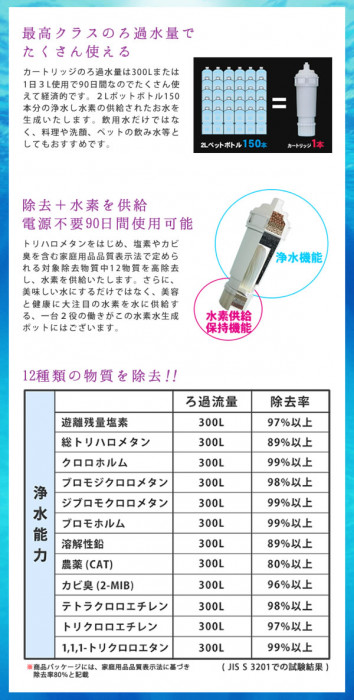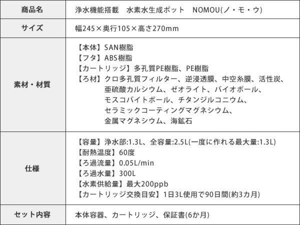 | 仕様 | 【容量】浄水部:1.3L、全容量:2.5L(一度に作れる最大量:1.3L) 【耐熱温度】60度 【ろ過流量】0.05L/min 【ろ過水量】300L 【水素供給量】最大200ppb 【交換目安】1日3L使用で90日間 |