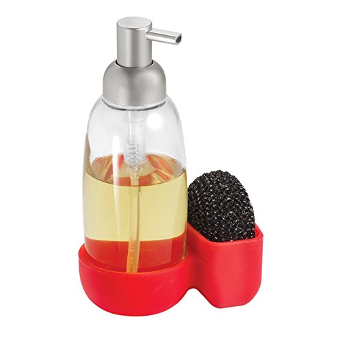 InterDesign Lineo Kitchen Glass Soap Dispenser Pump and Scouring Pad Caddy Organizer - Clear/Red/Brushed