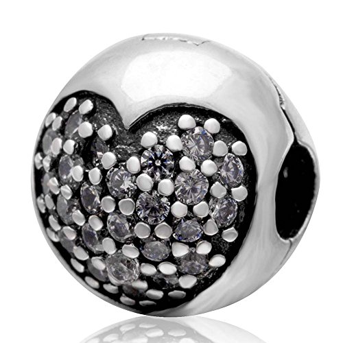Clip Stopper Charm With Crystal Charm 925 Sterling Silver Round Charm Heart Charm Lock Charm Spacer Charm for Bracelet (White)