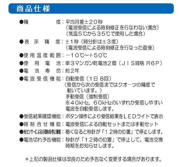 付属品単3マンガン乾電池×2個、木ねじ(木の厚い壁・木の柱専用)×1本、石膏ボード用掛具(掛金具×1個・釘×5本)、取扱説明書、保証書(保証期間:1年間)