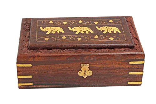 -. Brand : IndiaBigShop -. Color : Brown -. Department : womens -. EAN : 0739027494782 -. Feature : Dimensions: Length - 8 inches; Width - 5 inches; Height - 2.5 inches / Crafted using the finest richly hued timber Rosewood and further adorned with an exquisite brass inlay of Tripple elephant motifs and a hand carved floral trellis border. / The box comes with a velvet inner lining and a brass latch to keep the contents scratches free and secure. / Store your valuables like personal jewelry or family heirlooms and add a touch of class to your dressing table. / Handmade by skilled artisans from Saharanpur - India's largest hub for high quality wooden handicrafts. -. Label : IndiaBigShop -. Manufacturer : IndiaBigShop -. ProductGroup : Furniture -. ProductTypeName : HOME_FURNITURE_AND_DECOR -. Publisher : IndiaBigShop -. Studio : IndiaBigShop -. Title : xmas present, Wooden Jewelry Box with Triple Elephant Inlay Work, Jewelry Organizer Box, Wooden, Wooden Jewelry Decorative Box -. UPC : 739027494782