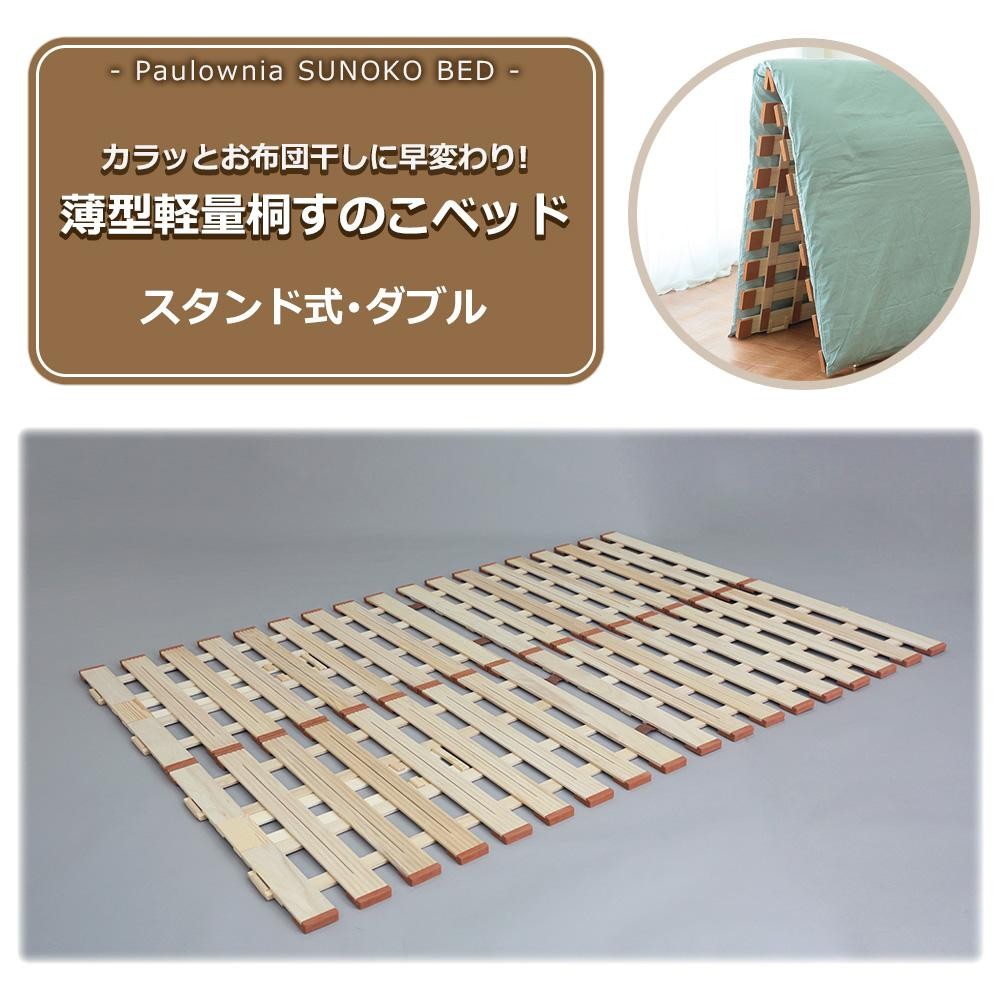 | 女性にも扱いやすい薄型・軽量すのこベッドスタンド式・ダブルサイズです。布団干しとしても使用でき、使わないときはコンパクトに折りたたみ収納が可能! |