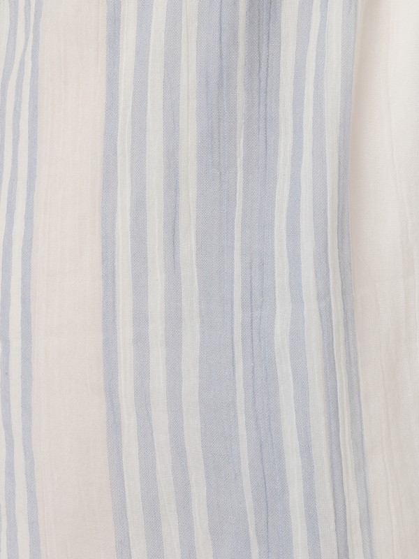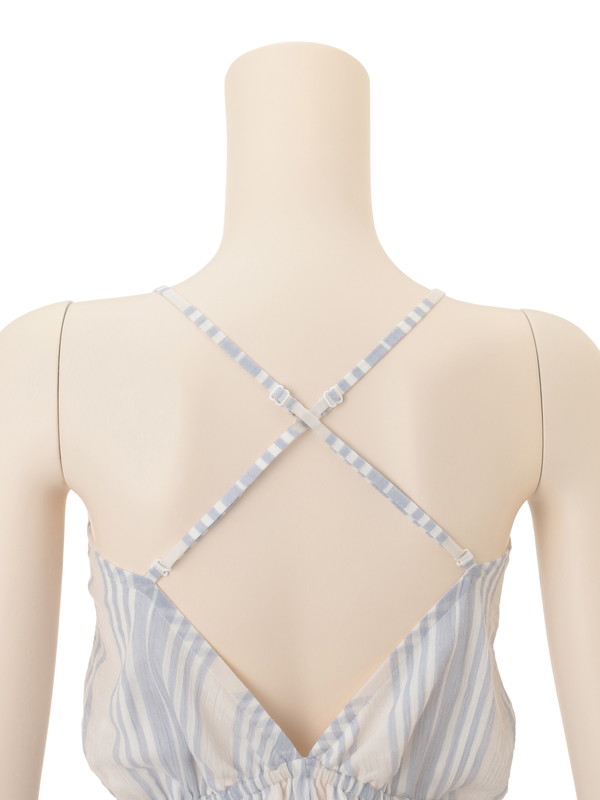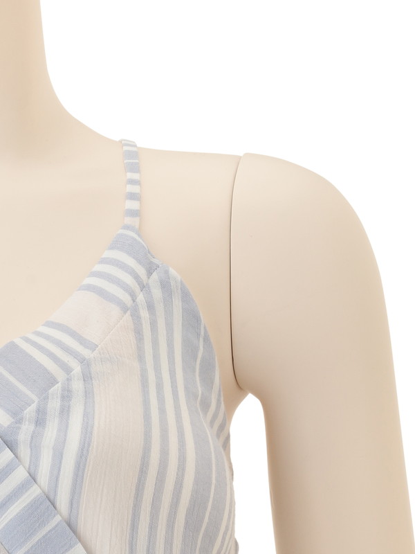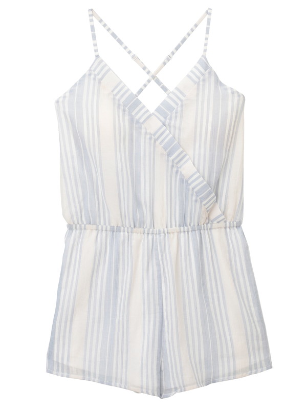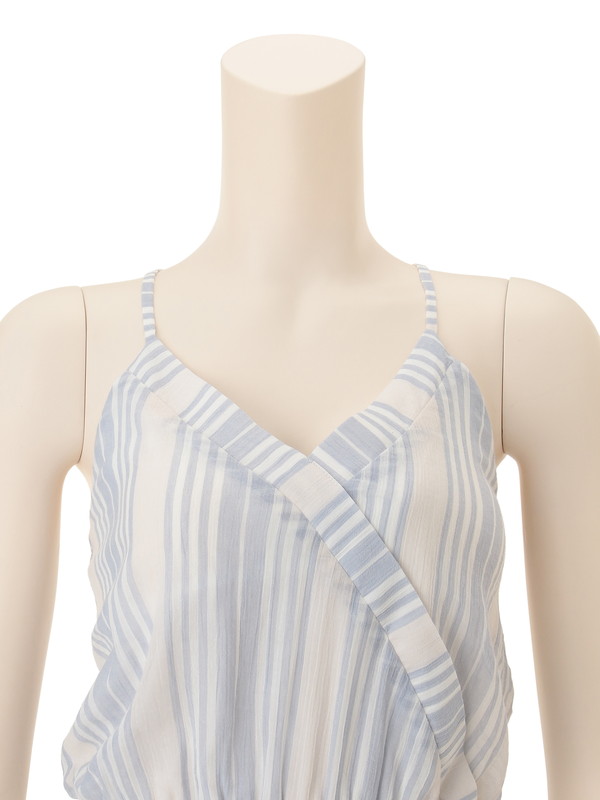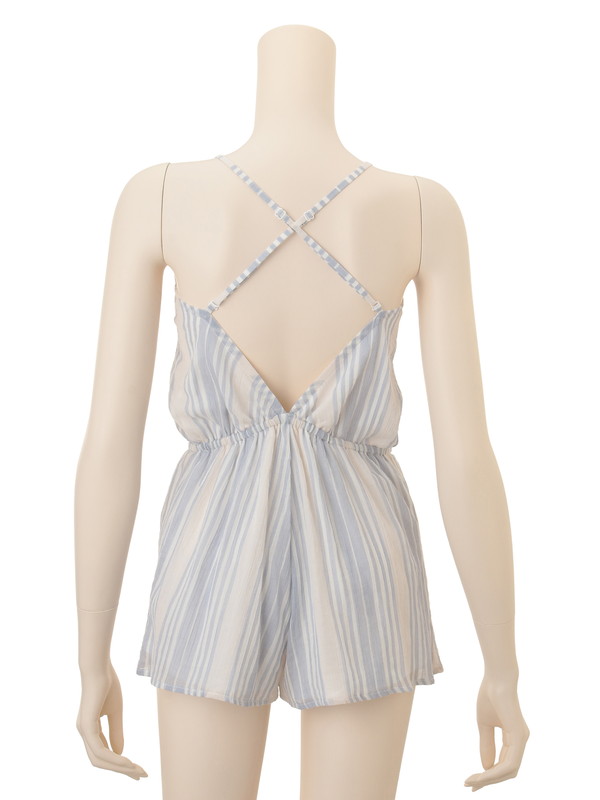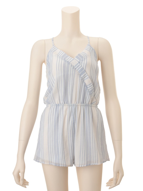 フレッシュなストライプのコットン生地で仕立てたロンパースは、カシュクールのデザインで大人の女性に似合う仕様。