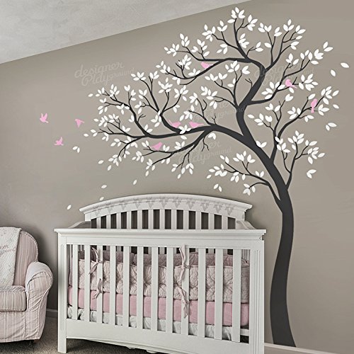 Designer Playground Large Natural Nursery Tree With Birds Vinyl Wall Decal (70W X 85H Inches ) MT030 - White Grey Pink