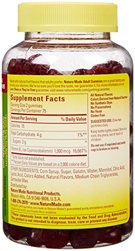-. Binding : Health and Beauty -. Brand : Nature Made -. EAN : 0031604041748 -. Feature : Nature Made Made with natural fruit flavors that adults prefer, Nature Made Adult Gummies are a great tasting way to take your vitamins Nature Made Adult Gummies are a great tasting way to take your vitamins Nature Made Energy B-12 Adult Gummies Cherry & Wild Berries -. IsAdultProduct : 0 -. Label : Nature Made -. Manufacturer : Nature Made -. Model : 4174 -. MPN : 4174 -. PartNumber : 4174 -. ProductGroup : Health and Beauty -. ProductTypeName : HEALTH_PERSONAL_CARE -. Publisher : Nature Made -. Studio : Nature Made -. Title : Nature Made Adult Gummies Energy B-12 Value Size-150 ct -. UPC : 031604041748