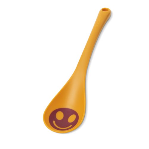- Bright colors and a happy face adorn the basting spoon