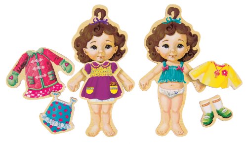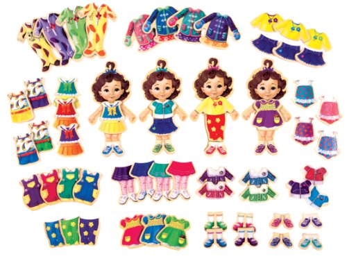 - Dress-up set includes four wooden magnetic quadruplets with over 64 beautifully illustrated wooden magnetic clothing pieces.