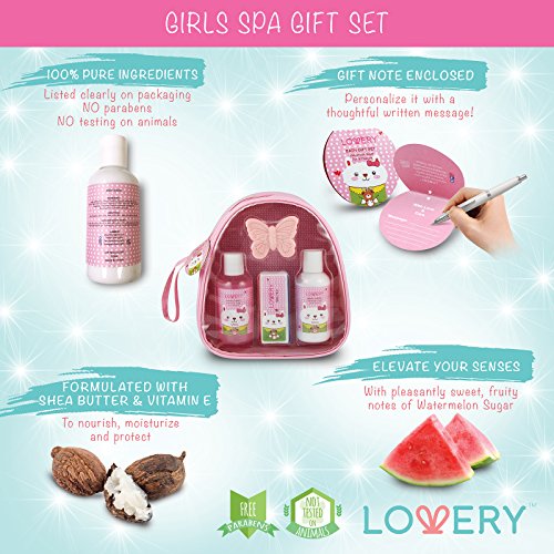 -. Feature : GIRLS JUNIOR SPA GIFT SET ❤ Upgrade bath time and give your pretty young diva the chance to experience a Just-Like-Mommy Spa Session! This loveable bath gift set is beautifully packaged in a durable carry bag and includes a Sudsy Bubble Bath, Luxurious Butterfly Shaped Bath Soap, Smoothing Body Lotion, Kiddie Nail File and durable carry bag to storage all beauty needs. / WATERMELON SUGAR FRAGRANCE ❤ She'll float on a cloud of euphoria with the sweet, juicy fragrance of Watermelon Sugar! This appealing scent is perfectly balanced with fresh, fruity notes to suit little girls and pre-teens, making them feel truly beautiful inside and out. / 100% SAFE & NATURAL ❤ Not only will she love using this Body Gift Set, you'll feel at ease knowing all products included are made out of pure, safe ingredients - proudly printed on the label. Formulated with SHEA BUTTER & VITAMIN E to moisturize and protect skin, Lovery's items are PARABEN FREE and NEVER TESTED ON ANIMALS, and never tested on animals. / THE HOLIDAY GIFT SHE'LL ADORE ❤ Need a great gift for the princess that has gotten bored of literally every other toy or gadget out there? Enjoy their thrilled reaction when presenting this lovely junior spa set to your daughter, granddaughter, niece, sister, student - or any other girl between the age of 3 to 15! Make them feel truly cherished with this extraordinary gift. / LOVE IT OR MONEY BACK ❤ We're sure you'll be absolutely delighted with this Deluxe Kiddie Spa Set! But in case of any issues with your order or product, please do not hesitate to contact us. Our customer care team is here on standby, ready to help you out with a refund or replacement.