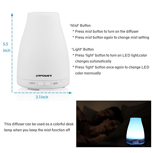 If the ultrasonic wave chip was polluted, it may cause error action or default. Tip:Oil is not included in the package Decription: Looking for a simple way to calm and freshen a room? The URPOWER® Ultrasonic Aroma Essential Oil Diffuser is elegant and easy to use. just add 100ML of water and a few drops of your favorite essential oil. Advanced ultrasonic vaporizing diffusion technology quietly releases a soothing fragrant mist up to 6 hours.
