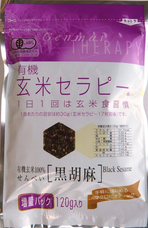 | 「玄米セラピー」はただのお菓子ではありません。玄米生食やマクロビオティックを実践するための玄米ごはんがわりのシリアルとしてご利用ください。1食あたりの目安は約30g(17枚前後)です。およそ茶碗半分の玄米ごはんの量に相当します。黒胡麻たっぷりの100%有機せんべい! |