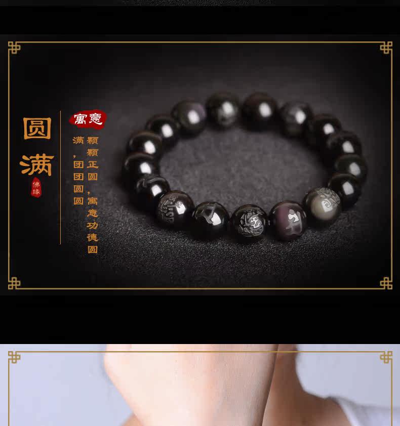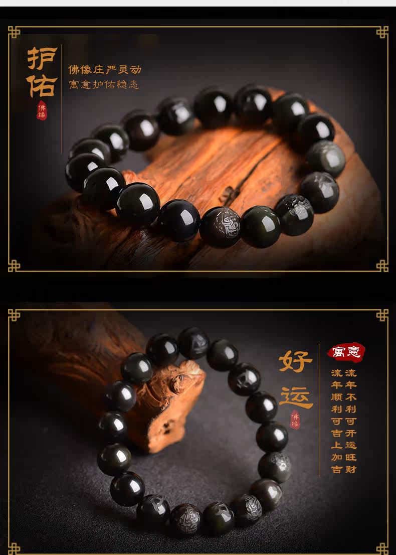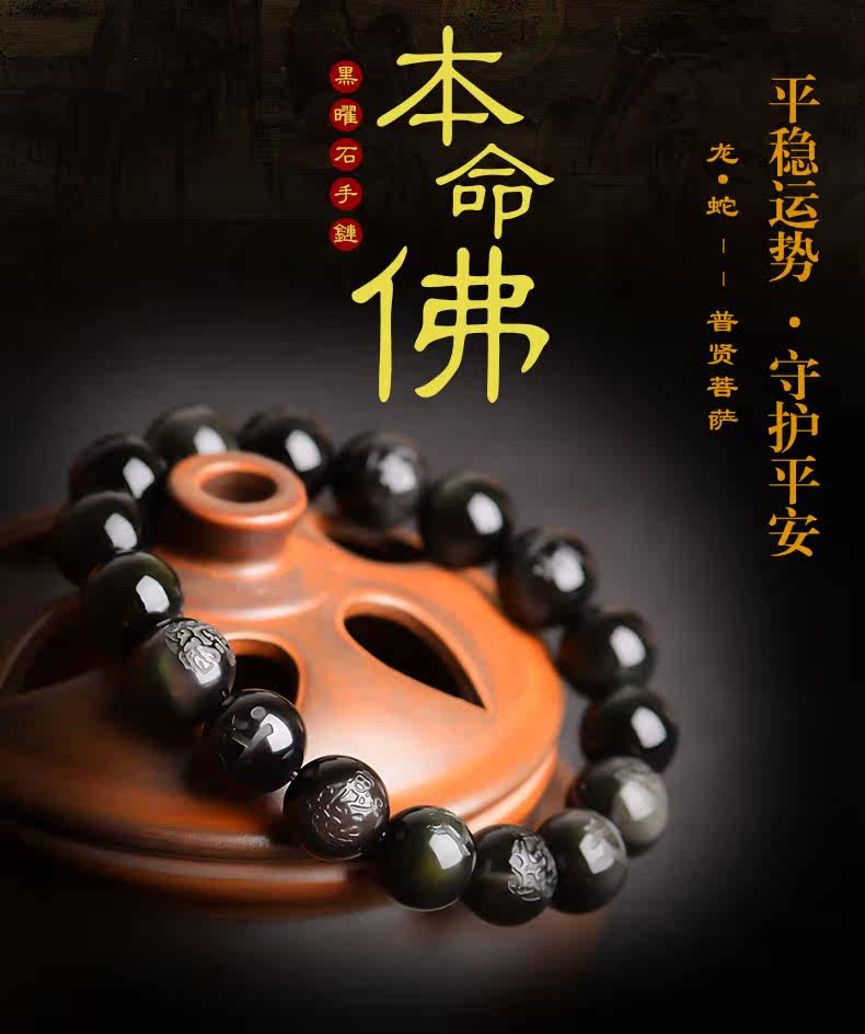 开光 天然黑曜石普贤菩萨手链 生肖属龙蛇本命佛守护神男女款手串