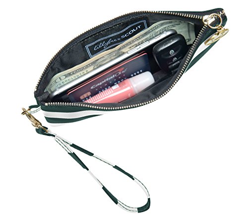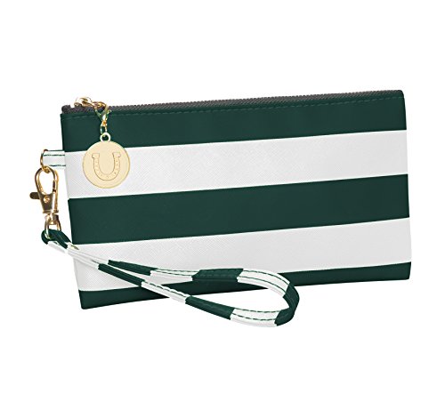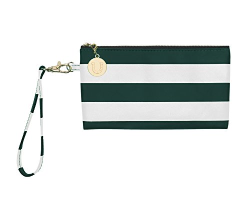 Product Description With this colorful and versatile dark green and white striped wristlet, you can use as a clutch or remove the wrist strap and use as a makeup bag inside your favorite tote. Cute and clever, these dark green and white stripes make the statement, while the charm provides the punctuation. 0