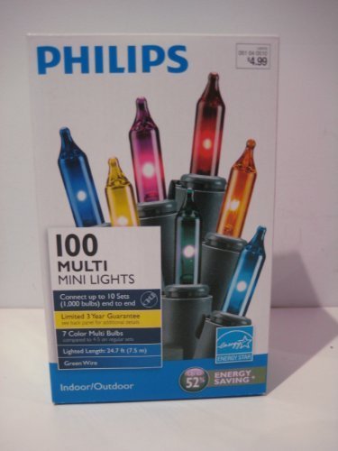 - 7 colors - red, yellow, blue, purple, amber, light blue, green, connect end to end up to 10 sets (1,000 lights) of the same Philips 100 mini light set.