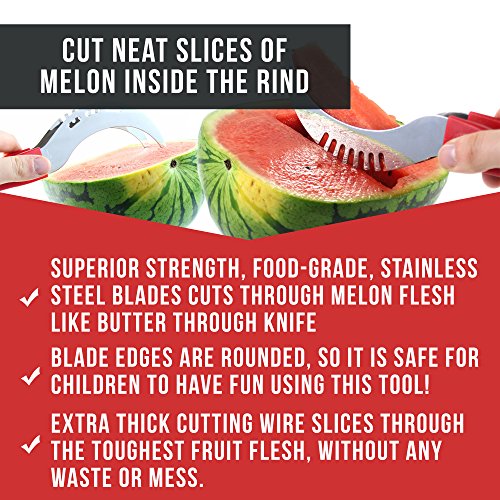- CUT, CORE, SCOOP, SLICE & CUBE WATERMELON EFFORTLESSLY – An amazing all-in-one invention that prepares melon in half the time of a knife, and no mess. No dirty, sticky and wet counters. You literally create a bowl out of the rind, so no fruit or juice is wasted! Pincer design so you can flip blades over to turn into tongs / server. No sticky hands. An essential gadget for watermelon, cantaloupe, honeydew etc. Use also to cut even slices of cake and serve without touching and damaging slices!