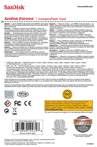 Studio : SanDisk Publisher : SanDisk Binding : Personal Computers Product Description The optimal combination of shot speed (up to 85MB/sustained video performance guarantee (VPG-20), and transfer speed (up to 120MB/s); 16GB - 128GB cards only. Ideal for use with mid-range to high-end DSLR cameras and HD camcorders, the SanDisk Extreme CompactFlash Memory Card delivers first-rate read/write speeds to catch fast action shots and enable quick file transfers. This memory card features Video Performance Guarantee (VPG-20) to deliver a minimum sustained recording data rate of 20MB/s to support high-quality Full HD video (1080p) recording. Take advantage of burst-mode photography with the card's write speeds of up to 85MB/s (567X) and enjoy efficient workflow with its transfer speeds up to 120MB/s (16GB - 128GB cards only). With capacities up to 128GB, this memory card provides plenty of storage for Full HD videos and RAW photos. 0