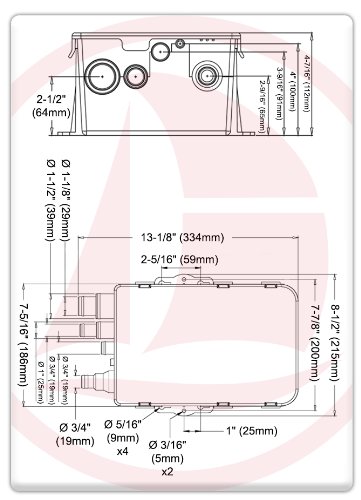 -. Feature : 750gph capacity. / 12v / Discharge: 3/4" / Multiple Inlet Ports: 3/4", 3/4" or 1", 1-1/8" or 1-1/2" / Dimensions: 10-3/4" (L) x 7-3/4" (W) x 5-1/4" (H)