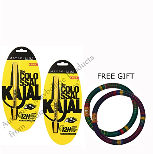 -. Binding : Misc. -. Brand : Maybeline New York -. EAN : 8906051305588 -. Feature : Special Offer: Pair of Traditional Exotic Multicolor Bangles as Free Gift. / Original & Authentic MAYBELLINE Product. Fast Order Processing with Free Shipping & FREE GIFT. Item will be shipped from our shipment office in India. It normally takes 10-15 business days in delivery to the USA via Global Priority Airmail Post. Signature will be required at the time of delivery. / Unique tip delivers the blackest black shine ever / Exclusive colour fix formula guarantees intense color results / Enriched with Vitamin E that soothes the eyes -. Label : Maybelline -. Manufacturer : Maybelline -. ProductGroup : Beauty -. ProductTypeName : BEAUTY -. Publisher : Maybelline -. Studio : Maybelline -. Title : Maybelline Colossal Kajal 12H Black Pack Of 2 - With FREE GIFT Pair of Multicolor Bangles