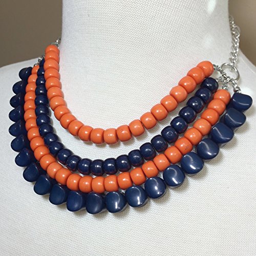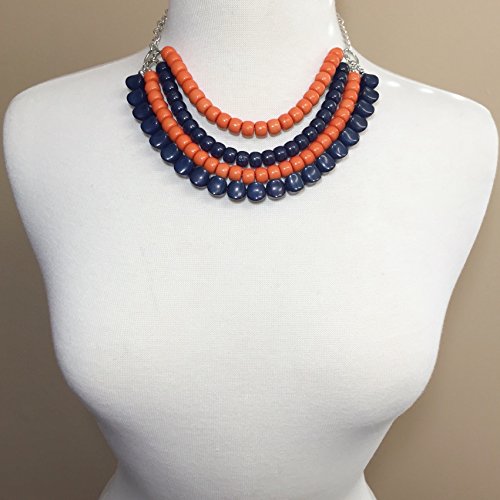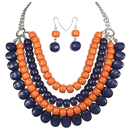 4 Row Layered Bib Bubble Statement Silver Tone Necklace & Earrings Set (Orange & Navy Blue)