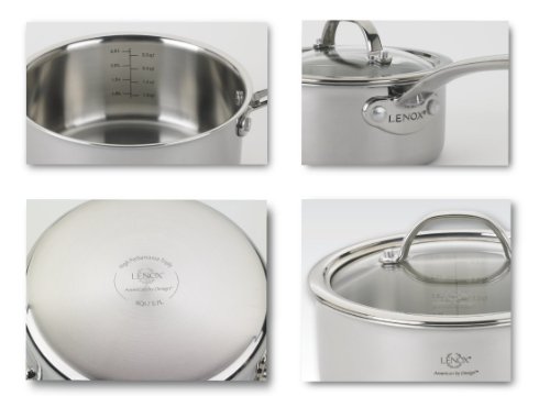 -. Feature : • Full Tri-Ply Clad body with a thick aluminum core sandwiched between premium stainless steel ensures even heat distribution along the bottom and sides / • Stainless Cast handles are riveted for durability and are angled to provide better leverage that makes pans easier to use. Each handle is uniquely cast with an elegant Lenox logo as part of the design. / • Tempered Glass lids with seamless stainless rim, are designed to capture steam and slowly add back liquid into the vessel tenderizing as you cook. / • Inside capacity marks (both Imperial and Metric) on sauce pans, Sauté pan, and stock pot simplify cooking preparation / • Suitable for: Ceramic, Gas, Halogen, Electric, and Induction Stove Tops, Oven safe to 500ºF, Dishwasher Safe, LIFETIME WARRANTY