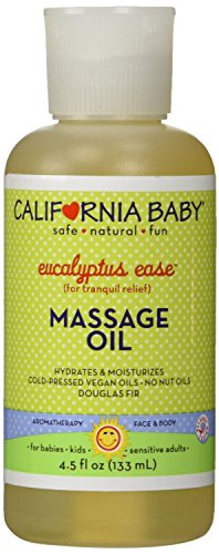 -. Binding : Health and Beauty -. Brand : California Baby -. Department : Natural Health -. EAN : 0593159035141 -. Feature : Colds & Flu aromatherapy blend works to relieve congestion and stuffiness / Our custom pump locks in the 'up' position eliminating accidents on the road or in the diaper bag / Our vegan oils are cold pressed, which means that no solvents are used for their extraction / Contains organic & sustainably grown ingredients / Seal in moisturizing after showering - apply California Baby Massage Oil to damp skin...leaves skin satiny soft with a wonderful non-greasy glow -. IsAdultProduct : 0 -. Label : California Baby -. Manufacturer : California Baby -. Model : 792692334630 -. MPN : 510-4-5 -. NumberOfItems : 1 -. PackageQuantity : 1 -. PartNumber : 510-4-5 -. ProductGroup : Health and Beauty -. ProductTypeName : HEALTH_PERSONAL_CARE -. Publisher : California Baby -. ReleaseDate : 2010-12-10 -. Size : 4.5oz oil -. Studio : California Baby -. Title : Eucalyptus Ease Massage Oil 4.5 oz -. UPC : 792692334630