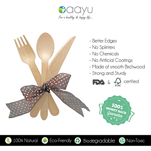 100% NATURAL PREMIUM UTENSIL SET! Unlike regular wooden disposable utensils that come with chemical-filled waxes and smelly coatings, our spoon fork knife set is made of natural Birch wood, is FDA & FSC Certified for conforming to strict health standards, and has zero odor(Safe for Children, kids lunch box). EXTRA SAFE!