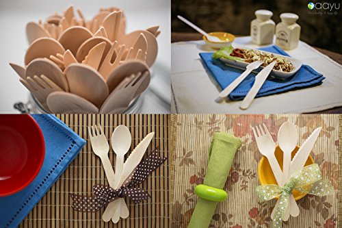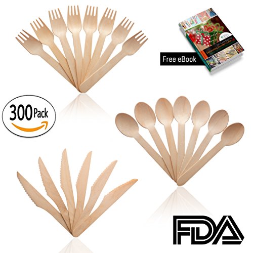 100% Natural FDA Certified Eco Friendly Wooden Disposable Utensils Set (300 Pieces) 100 Spoons 100 Forks & 100 Knives | For Weddings Parties Camping BBQ Birthdays Beach | Compostable Cutlery Bulk Set