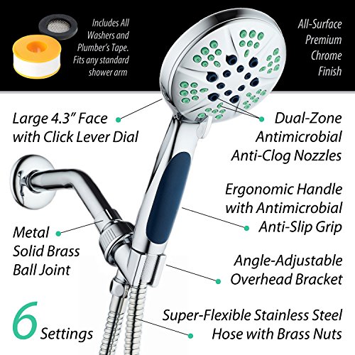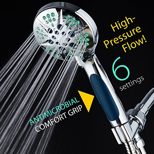 - 6 SETTINGS PLUS ANTIMICROBIAL SLIP-FREE GRIP: Instantly transform your ordinary shower into a truly PURE Luxury Shower Spa! Enjoy Power Rain, Pulsating Massage, Hydro-Mist and two mixed settings, or use Convenient ON-OFF Pause Mode to save water. Giant 4.3" face with Antimicrobial / Anti-clog Jets delivers extra-wide flow coverage with amazing water pressure! Antimicrobial Slip-Free Handle provides extra safety and better hygiene for hand-held use. Ideal for children, elderly & disabled.