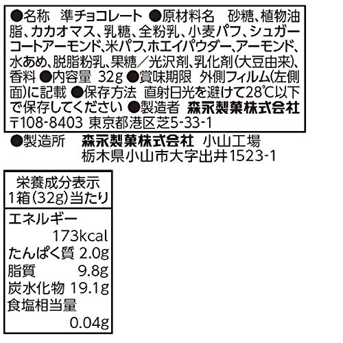 原材料:砂糖、植物油脂、カカオマス、乳糖、全粉乳、小麦パフ、シュガーコートアーモンド、米パフ、ホエイパウダー、アーモンド、水あめ、脱脂粉乳、果糖/光沢剤、乳化剤(大豆由来)、香料