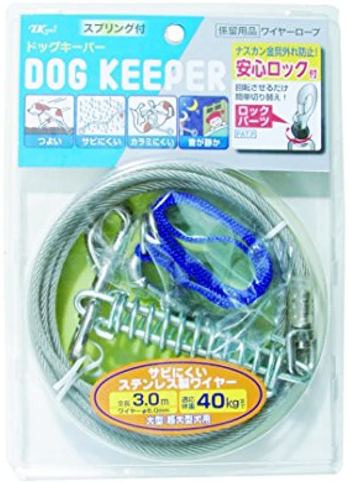 | (商品詳細) 「ドッグキーパー 大型・超大型犬用 XL/3m DK-XL/300」は、ナスカン金具外れを防止する安心ロック付きの係留用ワイヤーロープです。 ステンレス製のワイヤーなので丈夫で長持ち。 音も静かです。 使用方法 一方を係留元に繋ぎ、もう一方を首輪に繋ぐ。 製品仕様 ●適応犬種:大型・超大型犬 ●適応体重:40kgまで ●全長:3.0m ●ワイヤー:直径6.0mm ●材質:鉄、亜鉛、ビニール、POM 原産国 台湾 | |