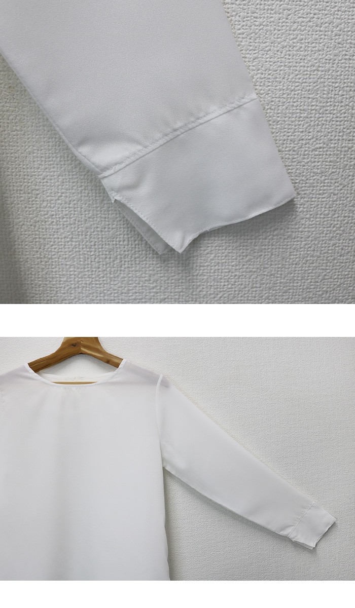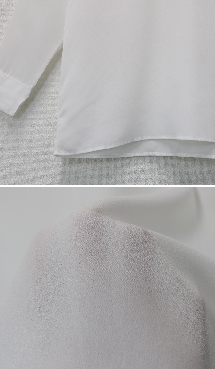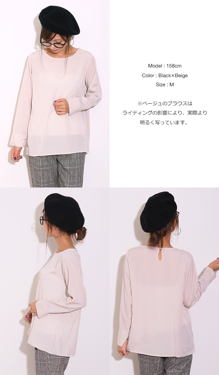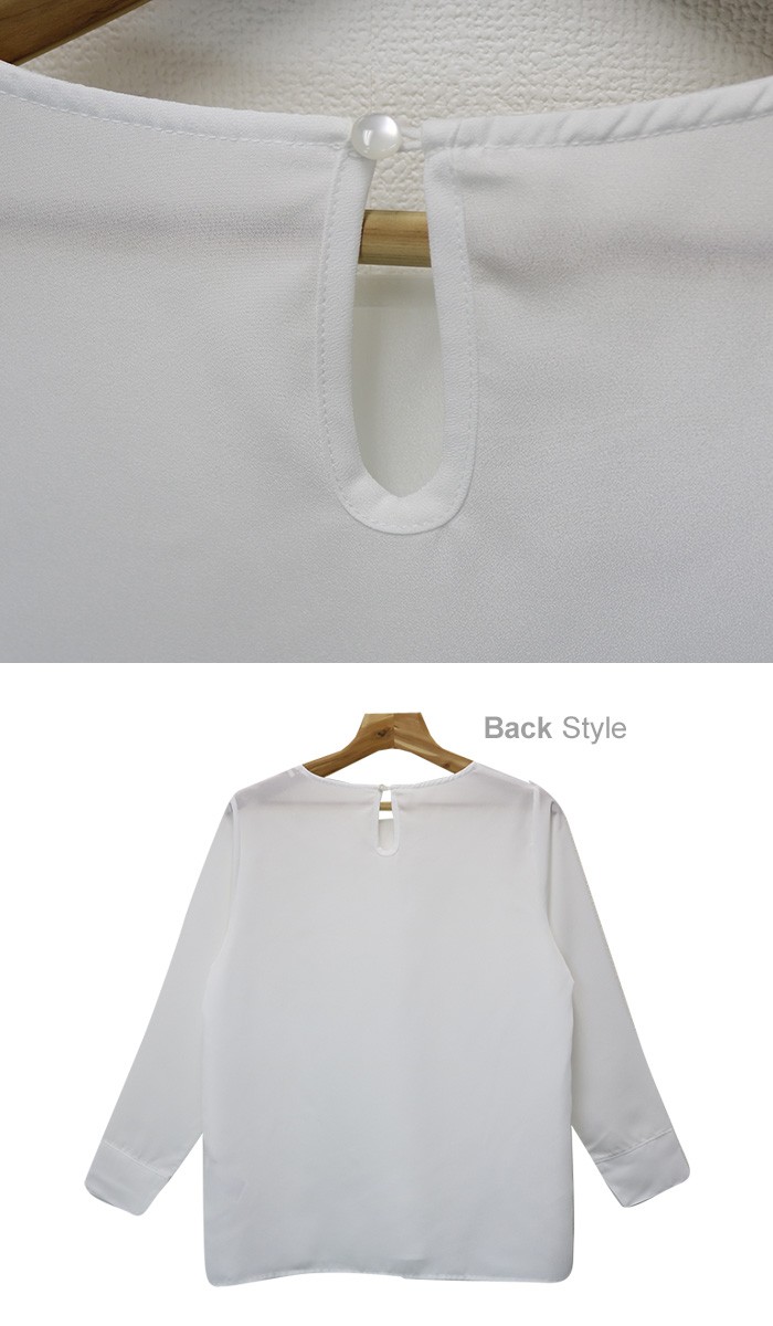 シフォンブラウスはクルーネック、背中部分は涙開きのボタンを使用して着脱するデザインです。